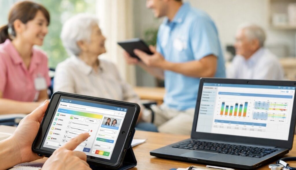 新年度を迎えるにあたり、当施設では 記録業務の効率化と質の向上 を目的として、記録ソフトの導入準備 を進めています。介護現場では、日々の記録がとても大切である一方「記録に時間がかかる」「あとでまとめて書くことが多い」といった声も少なくありません。そこで今回、タブレットを活用した記録ソフト を導入することで、職員の負担軽減と、より良いケアにつなげていきたいと考えています。記録ソフトは、タブレットを使って その場で・簡単に入力 できるのが大きな特徴です。これにより、「記録のための時間」から「利用者様と向き合う時間」へ、より多くの時間を使えるようになります。